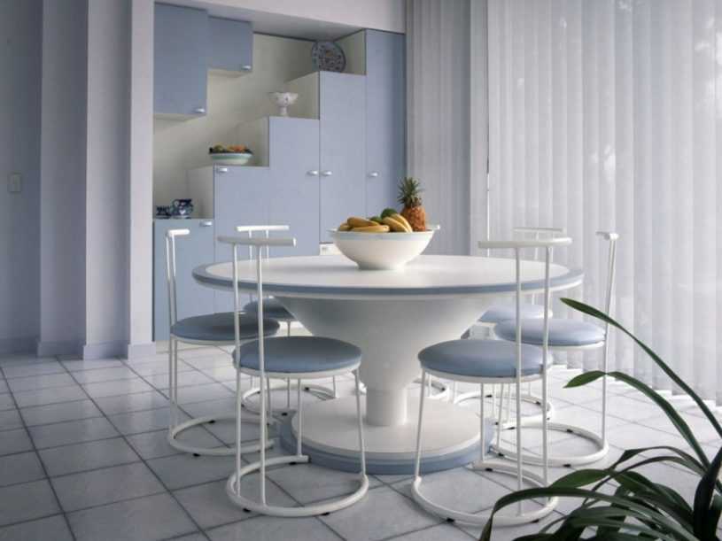 Обивка мягких и полумягких стульев должна соответствовать стулу, иметь белый или приближённый к белому оттенок. Часто белую мебель используют для оформления кухни.