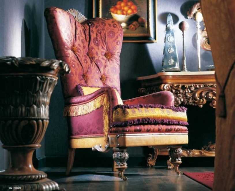 - барокко, ренессанс – подразумевают роскошь, даже помпезность в оформлении. Ножки, спинки, сиденья изделий имеют сложную конфигурацию. Дерево обильно украшено причудливой резьбой. Возможна инкрустация перламутровыми или металлическими вставками. Модели только мягкие. Для обивки берут яркую парчу с геральдическим узором, цветной сатин, полосатый шелк;