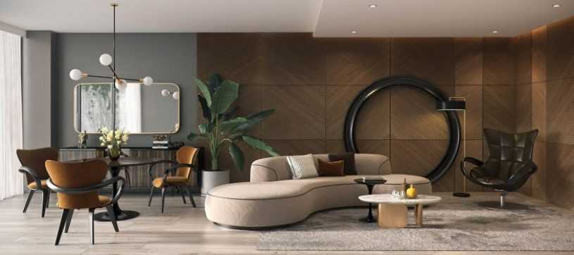 - Модерн — стиль, зародившийся на заре прошлого века и сохраняющий актуальность, предполагает плавные линии в интерьере, зонирование, приоритет пастельных тонов и отсутствие лишнего декора. Современный модерн — один из экономных вариантов интерьера, поскольку не требует использования натуральных материалов. Кресла для гостиной в этом стиле выглядят компактно, неброско. Они эргономичны, но недостаточно комфортны.