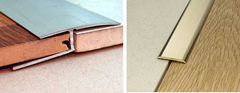 Выбирая, чем закрыть стык ламината и плитки, стоит обратить внимание на различие порожков (молдингов) и компенсаторных материалов. Наиболее долговечны изделия из металла (алюминий с отделкой и без, другие сплавы), им уступает качественный пластик (ПВХ), еще менее долговечны натуральная древесина и модели из МДФ с защитной отделкой. Для криволинейных стыков лучше всего подходят гибкие металлические и ПВХ-профили