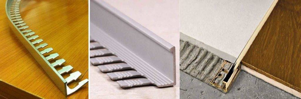 Выбирая, чем закрыть стык ламината и плитки, стоит обратить внимание на различие порожков (молдингов) и компенсаторных материалов. Наиболее долговечны изделия из металла (алюминий с отделкой и без, другие сплавы), им уступает качественный пластик (ПВХ), еще менее долговечны натуральная древесина и модели из МДФ с защитной отделкой. Для криволинейных стыков лучше всего подходят гибкие металлические и ПВХ-профили