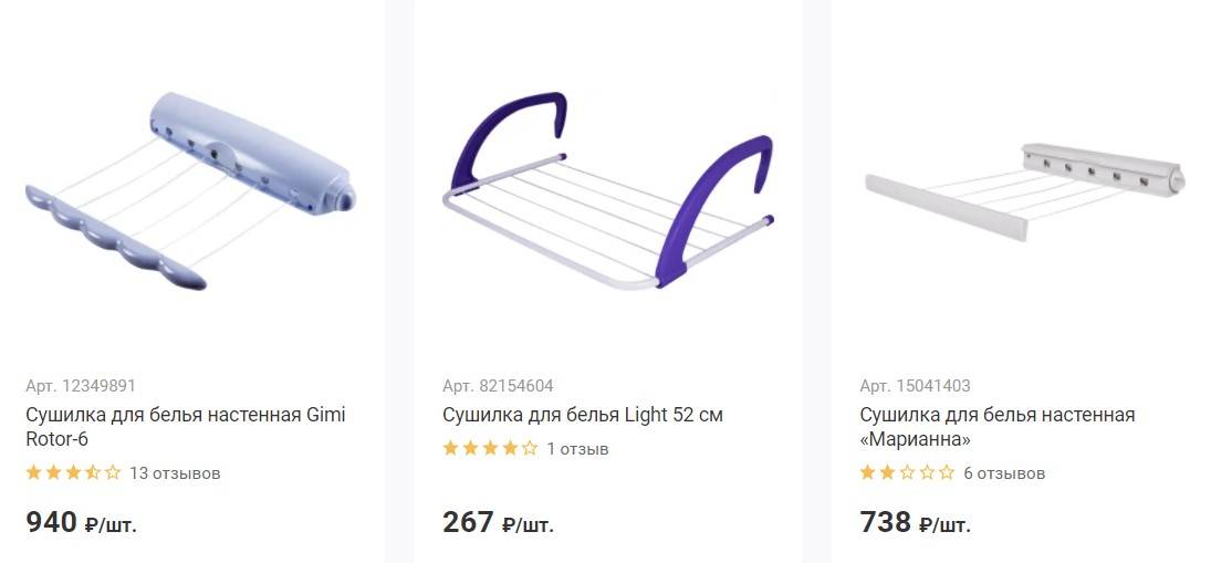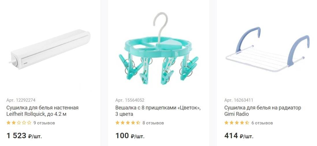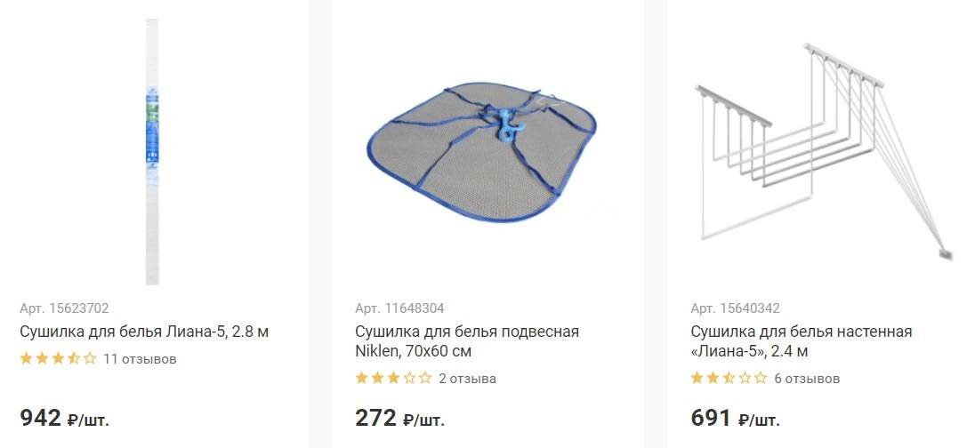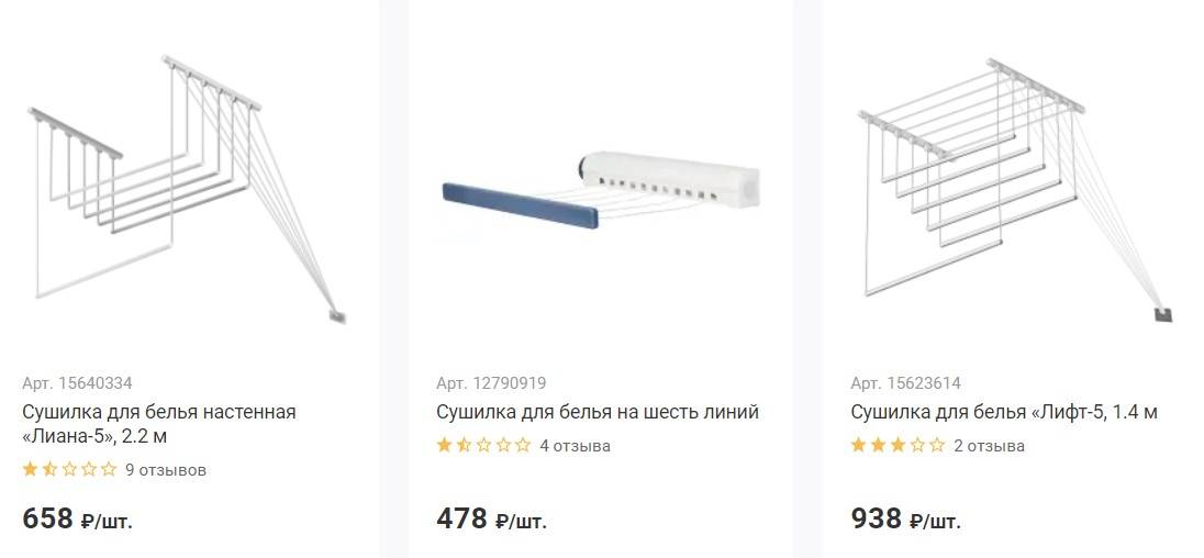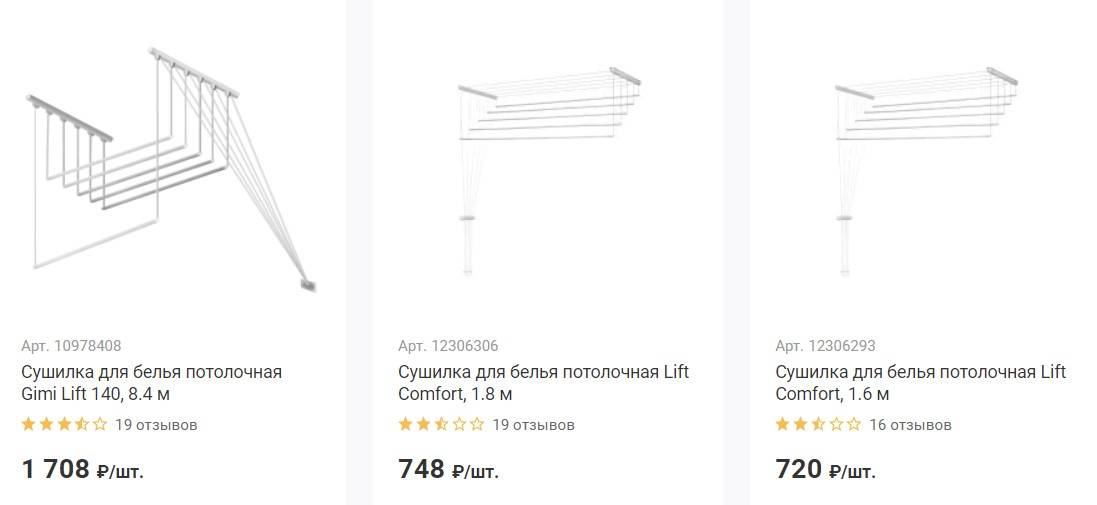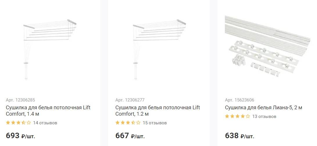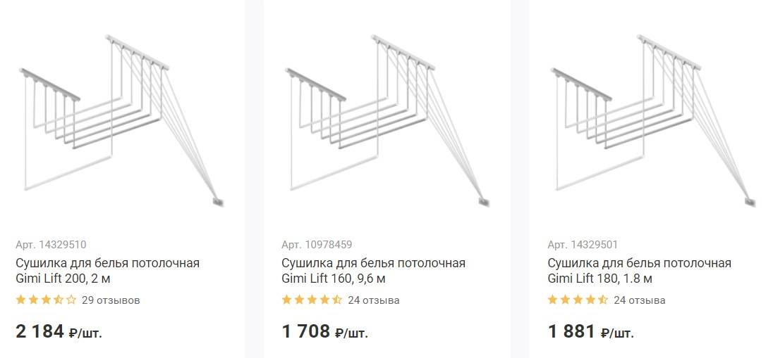 Стоимость сушилки для белья, которую нужно фиксировать на потолке, в гипермаркете варьируется в пределах 275-2185 рублей.