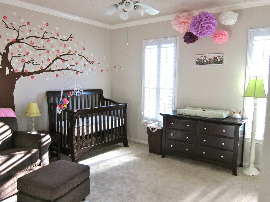 Темные шкафы интересно смотрятся если украсить их контрастными виниловыми наклейками. Под стеклянные дверцы можно подложить фотопечать в виде сказочных сюжетов. На полках рядами высаживаются яркие мягкие игрушки. Не забывайте добавлять в интерьер зеленые растения – они должны располагаться в легких пластиковых горшках вне зоны досягаемости, кроме того быть безопасными с точки зрения токсичности.