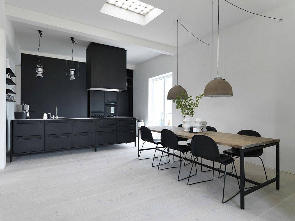 Окна обрамляются светлыми шторами, сгладить мрачность может белоснежный фарфор, расставленный на полках. Столешница, выполненная из натурального белоснежного мрамора, добавляет обстановке дороговизны.