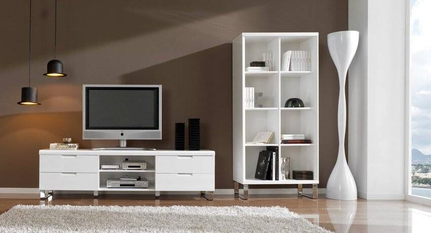 А вот телевизор черной или белой расцветки — совсем другое дело. Тогда как со снежно-белой стеной «хайтековой» гостиной телевизор белой расцветки, наоборот, не станет выглядеть гармонично.