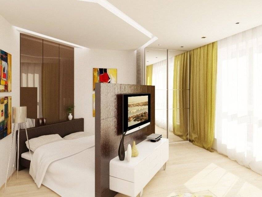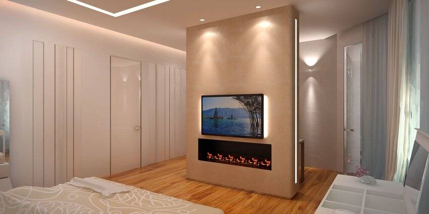Размещение телевизора на перегородке — современный вариант расположения техники в интерьере спальни. Межкомнатные перегородки выручают при обустройстве спального места в квартирах студийного типа.