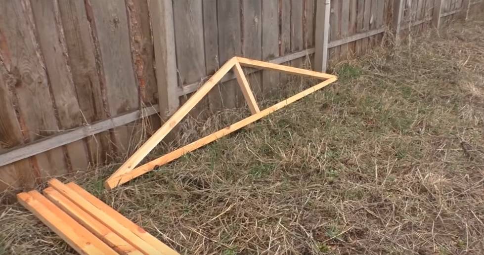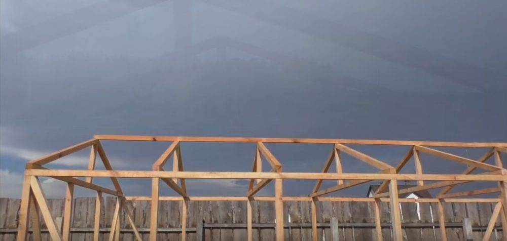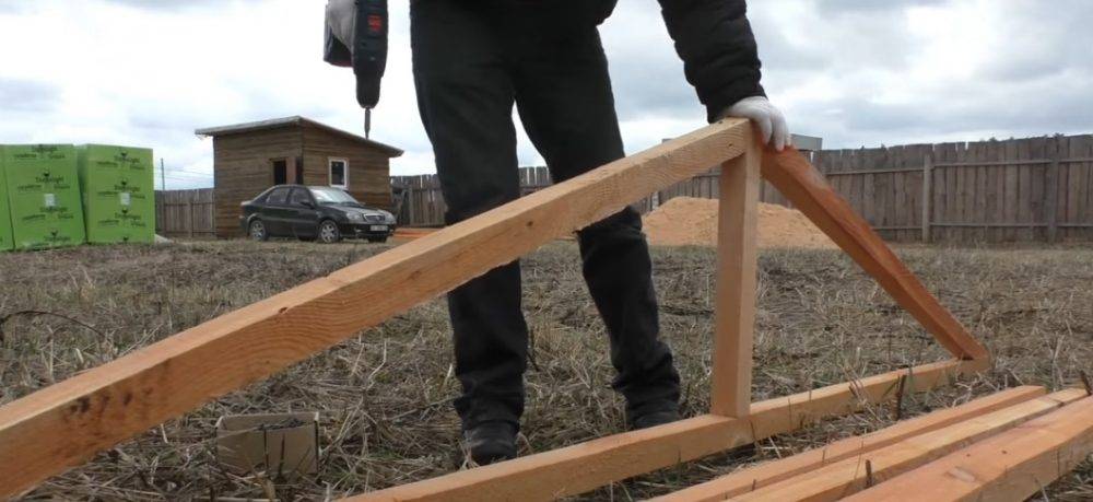 Шаг 8. Стропила крыши проще и удобнее собрать на земле. После этого устанавливаем их на верх конструкции.
