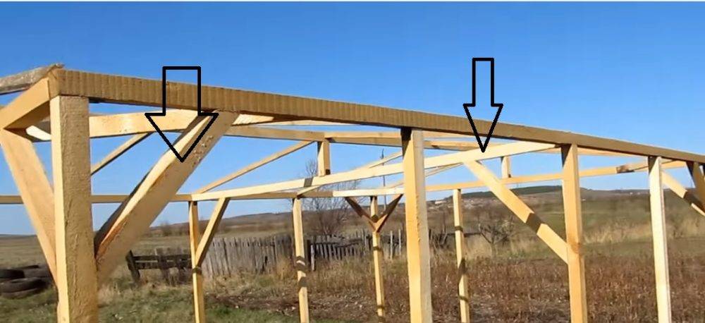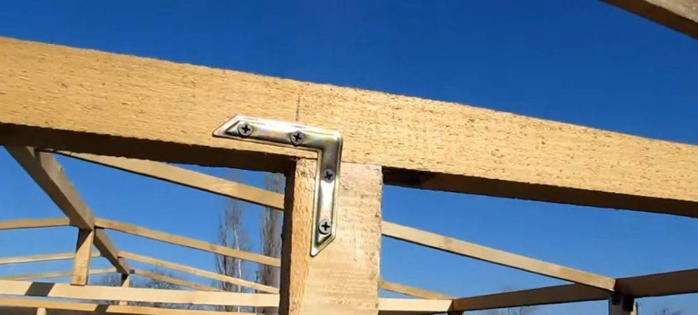 Если вы выбрали деревянный каркас, используйте брусья толщиной 100 мм. Если столбики уже установлены в фундамент, то брусья необходимо прикреплять наверху стоек и посередине. Стропила располагают на расстоянии 0,5 м. Для скрепления брусьев между собой используйте уголки и саморезы, а не гвозди.