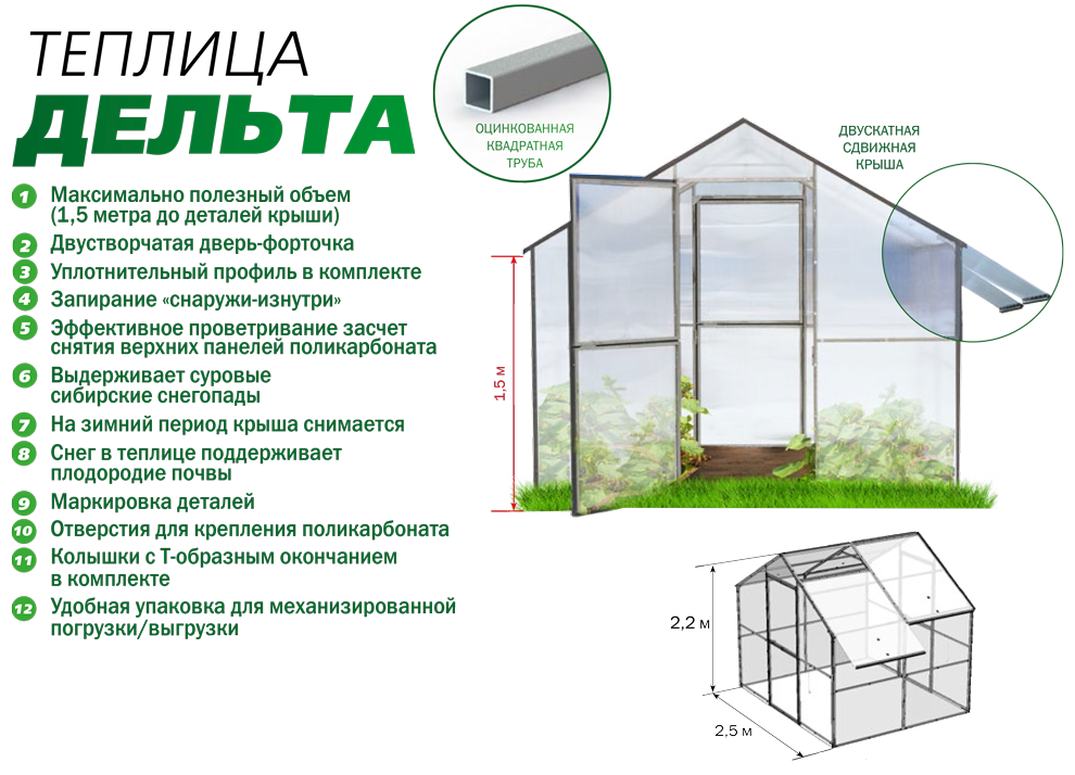 «Дельта» | Теплица изготавливается московской компанией «Воля», которая уже давно зарекомендовала себя надежным производителем. Изюминка заключается в следующем: конструкция имеет сдвигаемую крышу, которую удобно использовать для проветривания, а также легко снять и убрать на зиму. Эта мера помогает защитить теплицу от провала в зимний период. Каркас выполнен из оцинкованных труб сечением 20*20 мм. Расстояние между арками — 110 см. Ширина данной теплицы – 2,5 м, высота – 2,2 м. Модель достаточно компактна и не занимает много места. Покрытие – поликарбонат. Сборку удобно производить непосредственно на месте установки теплицы, при этом в фундаменте конструкция не нуждается – ее можно закрепить на грунте при помощи Т-образных деталей. |
