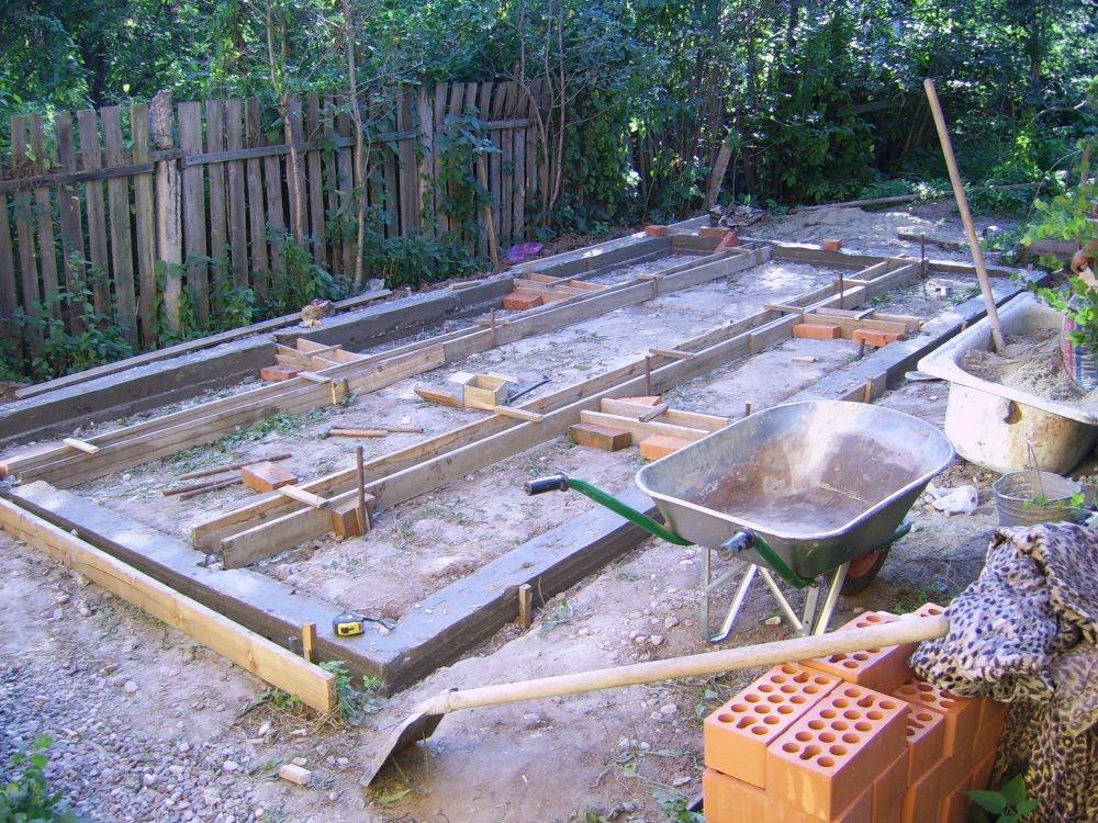 Для ленточного основания выкапывают ров глубиной 30-40 см, цоколь должен возвышаться над землей на 20-25 см.