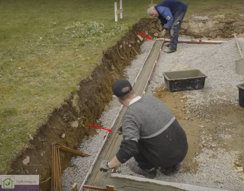 Шаг 9. Уложите прутья арматуры на бетон. Для большей прочности ленточного фундамента можно свить из проволоки сложную трехмерную конструкцию.