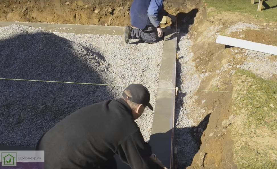 Шаг 10. Залейте бетонную смесь до края опалубки. Контролируйте горизонтальность при помощи уровня и натянутых веревок.
