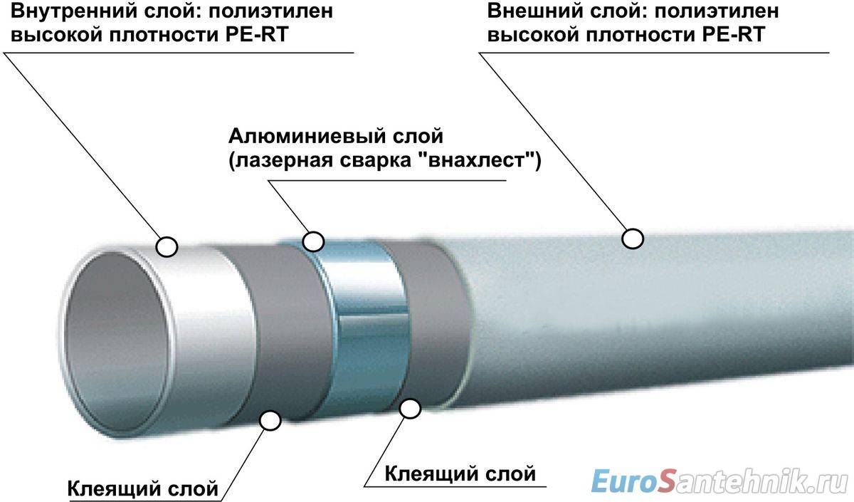 Эта труба состоит из 5 прослоек: первый, пятый слои — сшитый полиэтилен, второй, четвертый — клеевой слой, третий — фольга алюминиевая .
