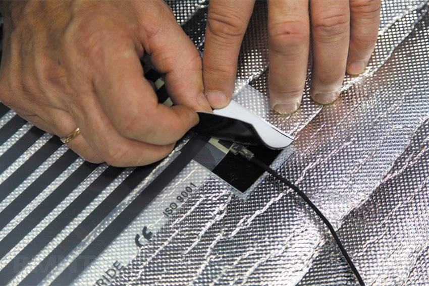 Кроме того, в местах соединения пленки с проводами предусматриваются массивные защитные элементы. Их требуется углублять в материал подкладки. Нельзя допустить, чтобы они возвышались над уровнем пленки. Линолеум в этом месте быстро протрется.