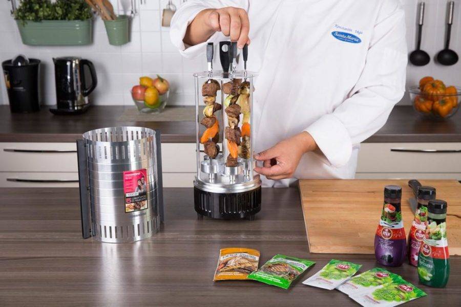Отзыв покупателя: Мясо, курица гриль получаются великолепно. Я разницы между шашлыком на углях и этим не вижу, только запаха дыма нет. В комплекте 7 шампуров, 1 вертел для курицы и 2 решетки для рыбы. Зажарить можно до 1,5 кг мяса, готовится 20-30 минут. Есть таймер. Из недостатков – большие куски прожариваются только внешней частью, так как шампуры не крутятся вокруг своей оси.