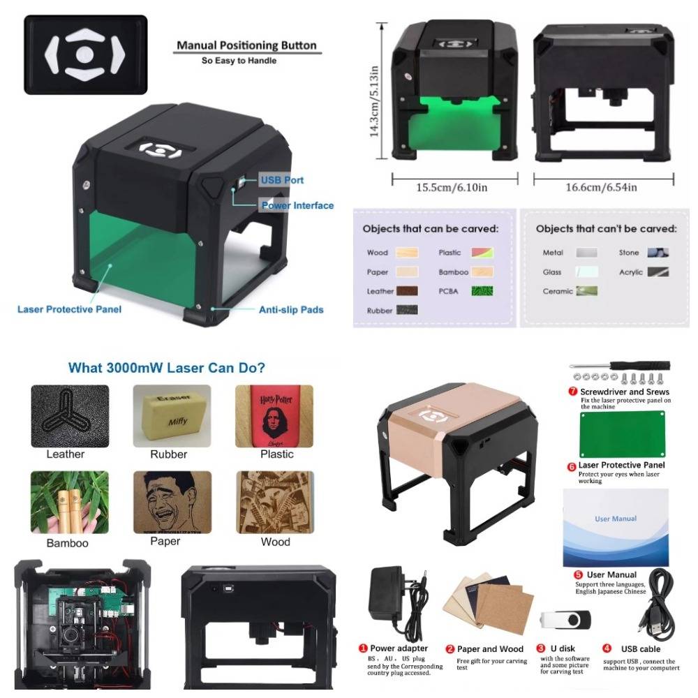 Автоматический высокоскоростной гравер с лазером мощностью 3000 МВт. Этого показателя хватает для комфортной работы по дереву, картону, коже и полимерам. Аппарат изготовлен из алюминия и высокопрочного АБС пластика. Обеспечивает нанесение гравировки с точностью 0,01 мм на глубину до 1 мм.