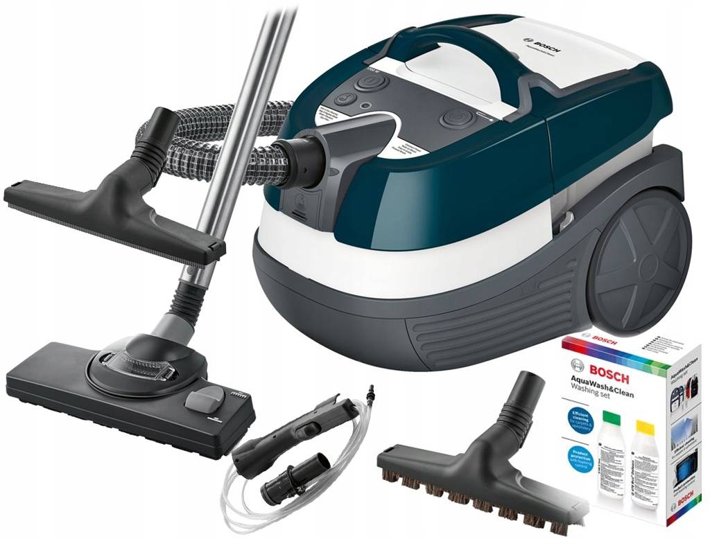 в комплект включена натуральная щетка, предназначенная для осторожной чистки паркетных полов, водяной фильтр и ряд специальных насадок;