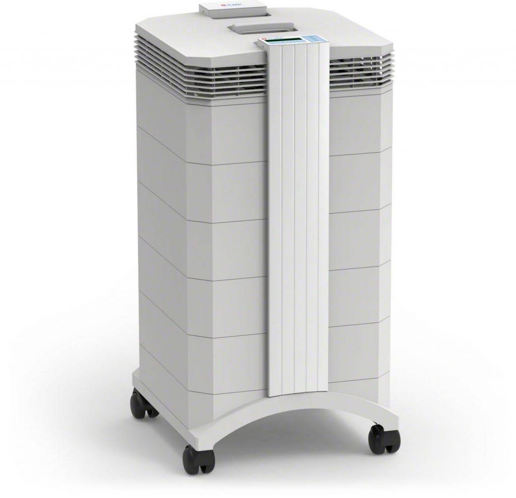 Этот рециркуляционный очиститель воздуха производится в Швейцарии. Устройство очищает воздух с помощью фильтров в три этапа: предварительный фильтр Pemax F8 (S) имеет площадь фильтрующего материала 2,8 кв.м. Основная его функция — предварительная очистка воздуха от крупной пыли. Угольный фильтр V5-cell имеет массу 2,5 кг. Его задача — устранение газов и неприятных запахов. На выходе прибора установлен HyperHEPA-фильтр класса H12/13. Этот фильтр имеет площадь фильтрующего материала 5 кв.м. Благодаря высокому классу фильтрации и площади фильтра, он эффективно задерживает аллергены, бактерии и вирусы, включая COVID-19