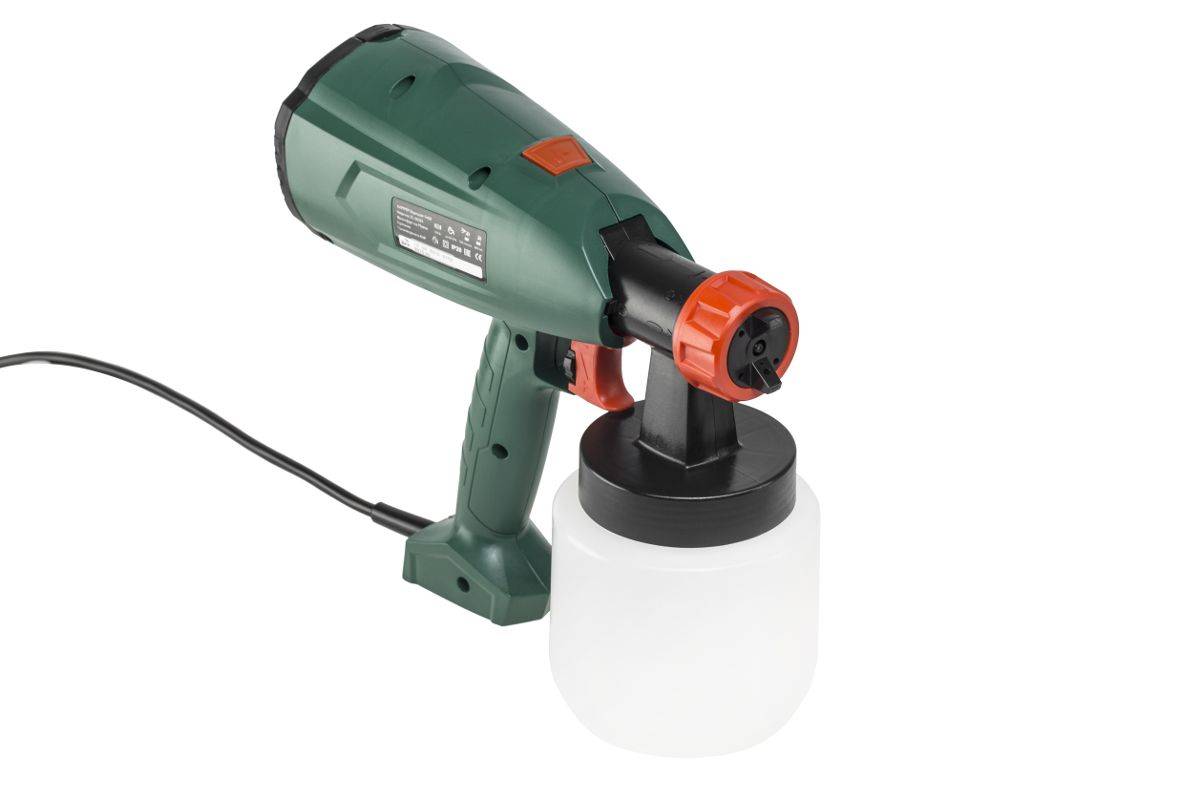 Сетевой краскопульт с отличным качеством сборки, емким бачком, латунными форсунками и гарантией в пять лет. В качестве распыляемого материала можно использовать эмаль, грунтовку, лак и краску.