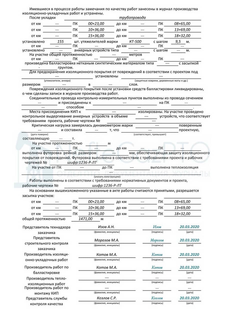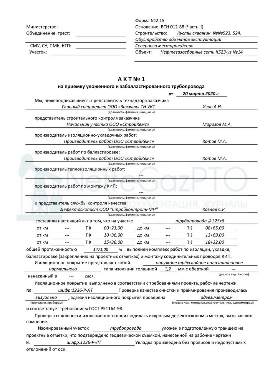 Пример оформления акта на приемку уложенного и забалластированного трубопровода по форме № 2.15