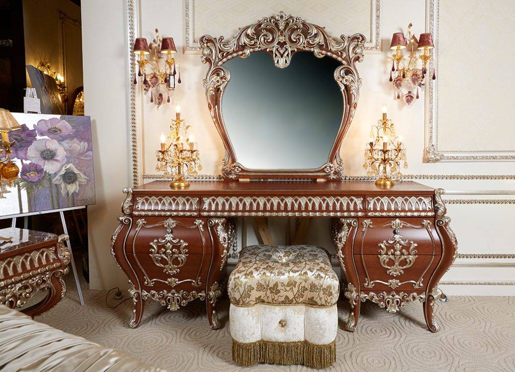 Если спальня оформлена в стиле ампир, барокко, гламур или прованс и напоминает будуар, то следует отдать предпочтение изящному трюмо, фото которого представлено ниже. Эффектно будет смотреться изделия в ретро-стиле с резной отделкой, дополненное винтажным пуфиком или невысоким креслом.