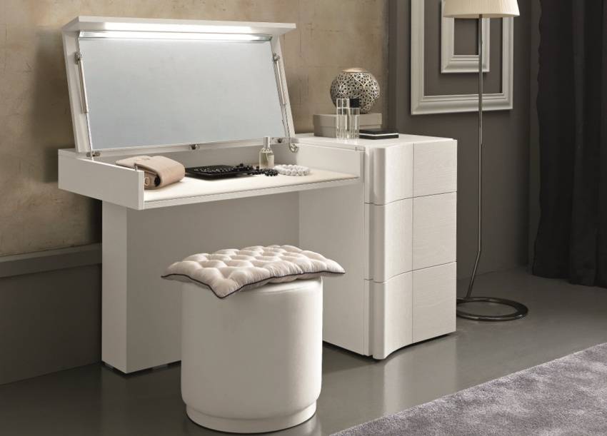 Туалетный и письменный столик – такой вариант изделия снабжен откидным зеркалом. В сложенном состоянии модель может использоваться как рабочее место. А когда требуется заняться уходом за собой, изделие раскладывается, и девушка получает полноценный туалетный столик с зеркалом и подсветкой. Преимуществом такой модели является наличие места для хранения. Еще такой стол представлен в вариации с отодвигающейся в сторону столешницей. При раскладывании верхний ряд ящиков сдвигается в сторону, столешница поднимается, и обладательница получает полноценный гримерный стол. Единственным минусом такого изделия является необходимость искать место для стула или пуфика.
