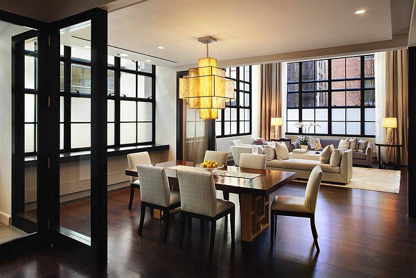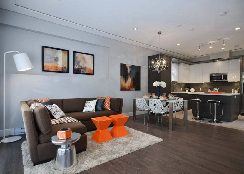 На большой квадратной площади проще выделять зоны, используя перегородки или мебель, при этом обстановку следует продумать так, чтобы в центре не оставалось пустоты. В маленькой квадратной гостиной-столовой нельзя допустить скученности мебели, даже ценой уменьшения количества предметов.