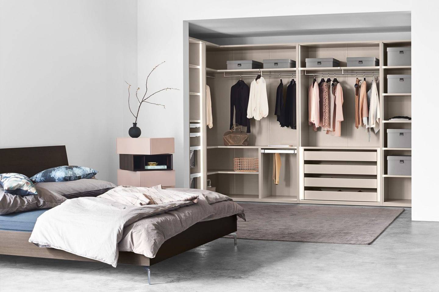 Если нет отдельных прилегающих пристроек, придется выделять место внутри спальни. Придуманы разные способы размещения. Самым востребованным является линейный тип хранения. Его располагают вдоль стены. Стандартная ширина конструкции – 1,2 м. Но для скромных помещений подходит идея мини-гардеробной. Для отделения от общей комнаты используются гипсокартонные перегородки, декоративные шторы.