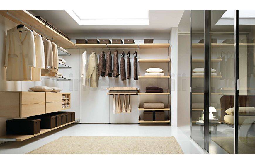 Если перед комнатой есть широкий коридор, проходная, то гардероб строится внутри по обеим стенам. Между вешалками, стеллажами оставляется минимум 80 см для свободного передвижения. Для обустройства используются открытые системы хранения, так как перегородки занимают место и визуально сужают пространство.