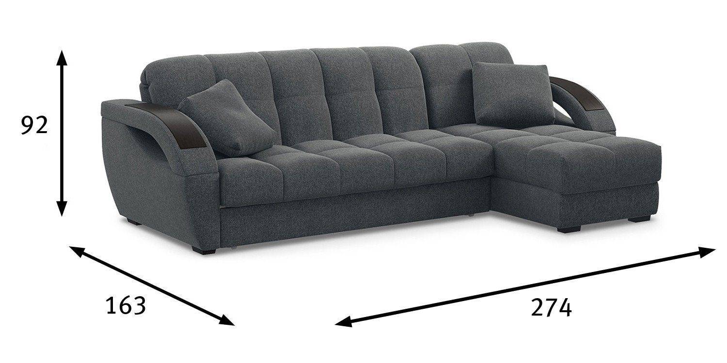 В собранном виде диван может иметь длину от 245 см до 260 см. В зависимости от клиентских предпочтений. Угол сиденья может быть от 150 см, с учетом спинки. Высота дивана может быть в районе 70-80 см.