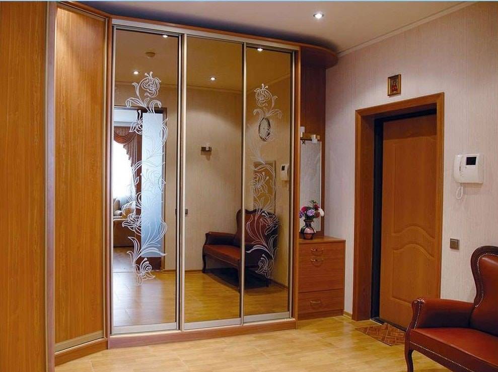 Более естественно и гармонично в интерьер гостиной вписываются радиусные шкафы-купе с вогнутым фасадом. Да и в небольших по размеру прихожих вогнутая форма фасадной части позволяет существенно сэкономить место.