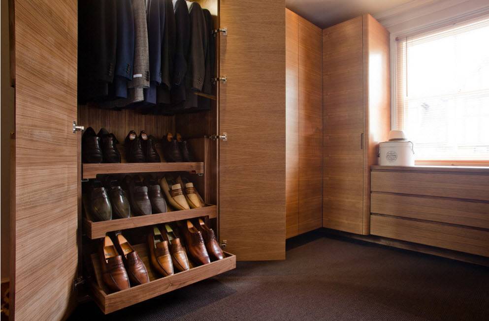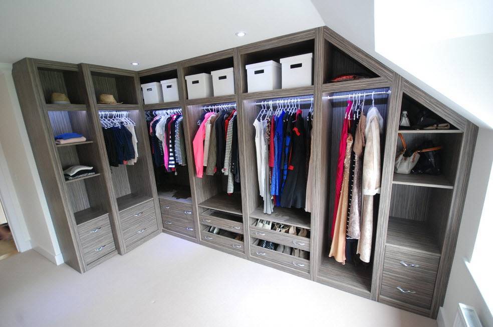 наверху хранят различные коробки, шляпки и другие вещи, которые нечасто используются в обиходе. Посередине располагается одежда, которую вы носите каждый день. Самый низ задействован для более тяжелых предметов.В угловой нише можно размещать штанги с рубашками и пиджаками.Зачастую, для хранения ремней и других мелочей встраивают ящики с выдвижным механизмом. Заказывая шкаф, нужно определить какие вещи вы собираетесь хранить, чтобы правильно рассчитать размер полок и ящиков