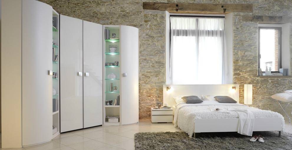 радиусный шкаф для спальной обладает вычурным дизайном, высоким уровнем вместительности, но стоит дорого. Поэтому подбирать его под маленькую спальню может быть нерационально;
