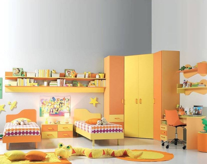 Желтый и оранжевый – это цвета детских спален. Солнечное настроение и заряд бодрости обеспечен. От этих цветов предметы зрительно увеличиваются. Их очень часто используют для изготовления мебели для детей.