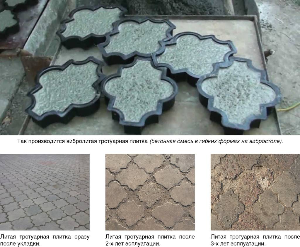 Особенность этой технологии в возможности ручного выполнения всех операций и малой автоматизации процесса, что сказывается на итоговой цене продукции. Вибролитые элементы внешне красивые и разнообразные (разная форма и рельеф лицевой поверхности). Однако есть и недостатки – низкая морозостойкость, высокое водопоглощение и истираемость, небольшая толщина и ограничения по сфере использования.