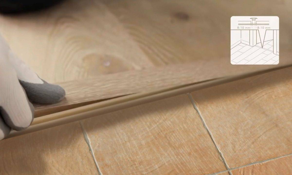 При безпорожковом соединении стыкуемую доску лучше приклеить. Для этого в подложке нужно вырезать часть под всей панелью или сделать несколько поперечных вырезов, куда будет наноситься монтажный клей. После приклеивания необходимо временно поставить груз, пока клей не подсохнет.