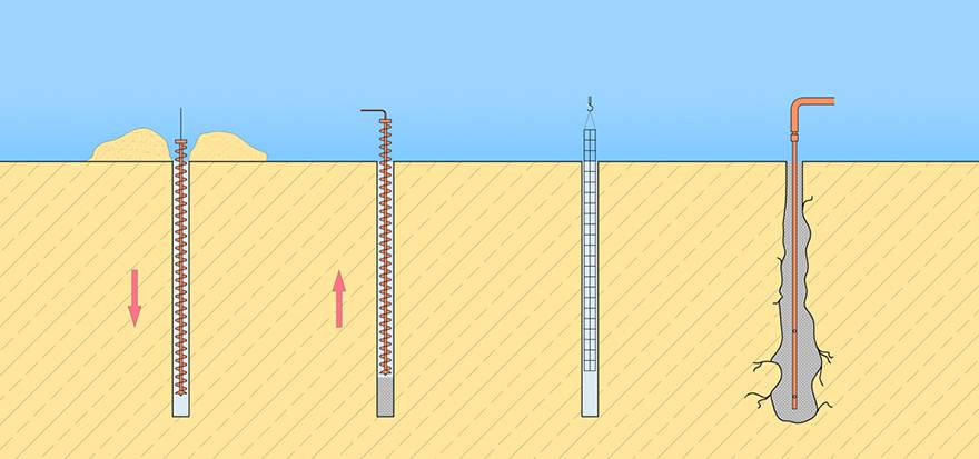 1. Бурение скважины 2. Заполнение скважины мелкозернистым бетоном с одновременным подъемом буровой колонны 3. Установка армокаркаса в скважину 4. Инъекция цеметного раствора в нижнюю часть скважины через специальную трубку