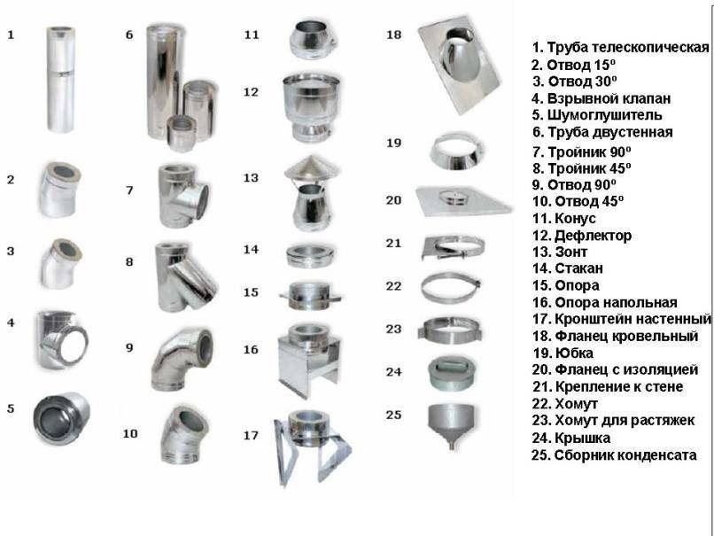 Обустройство системы удаления дыма требует применения для ее монтажа множества элементов. Основными деталями вытяжного канала для удаления продуктов сгорания являются: