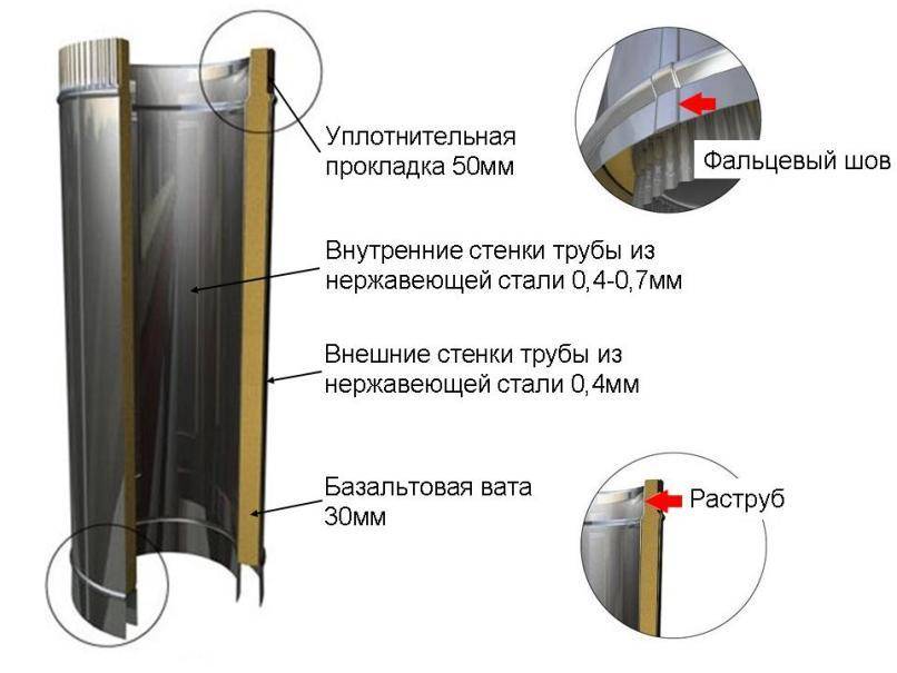 Труба в виде сэндвича представляет собой объединение двух металлических труб неодинакового диаметра, одна из которых располагается внутри другой. Образовавшийся зазор между ними уплотняется под большим давлением специальным огнеупорным теплоизоляционным материалом базальтовым волокном класса НГ. С целью упрощения монтажа применяются различные вспомогательные детали: