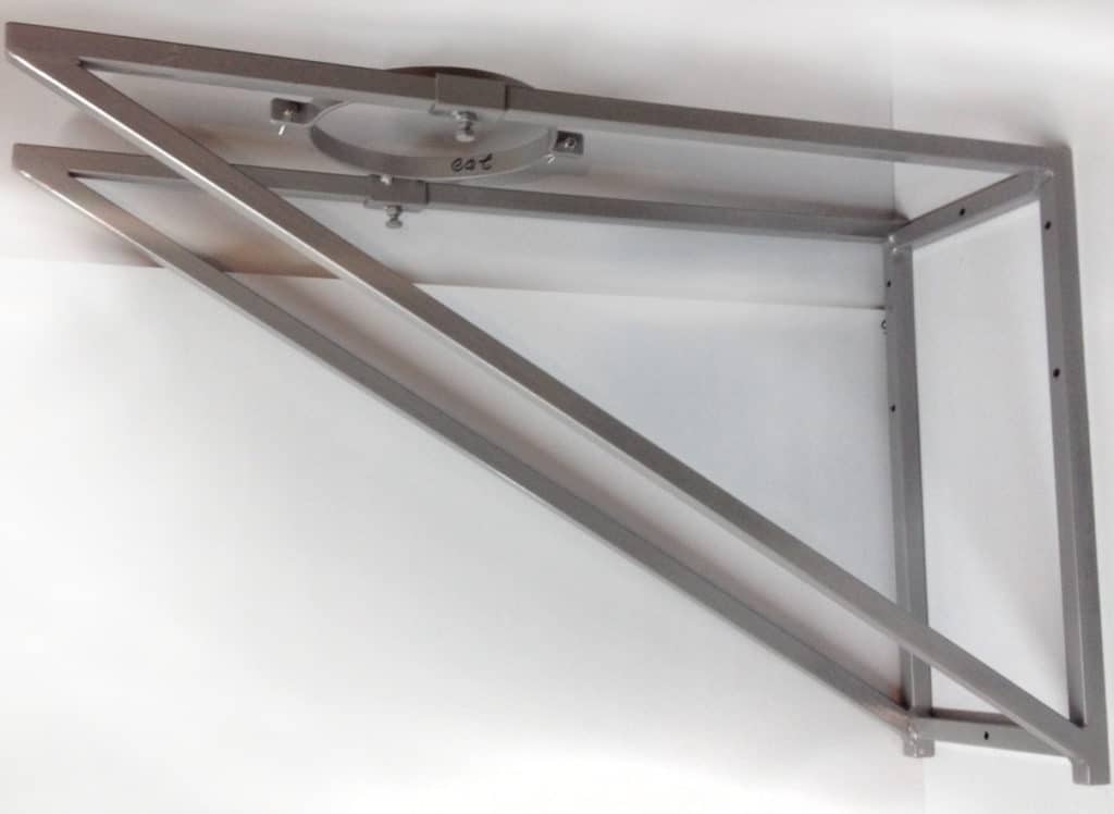 Это самый прочный и мощный вид – на него опирается весь дымоход. Обычно его выполняют из двух консольных треугольников из прочного металлического профиля толщиной стенок 1-3 мм. Со стороны стены и со стороны улицы они соединены перемычками, придающими дополнительную жесткость конструкции. Сверху крепится опорная площадка с вырезом под ревизию с краном для слива конденсата. Иногда вместо площадки используют еще одну перемычку, и нижняя кромка трубы опирается на квадратный контур.