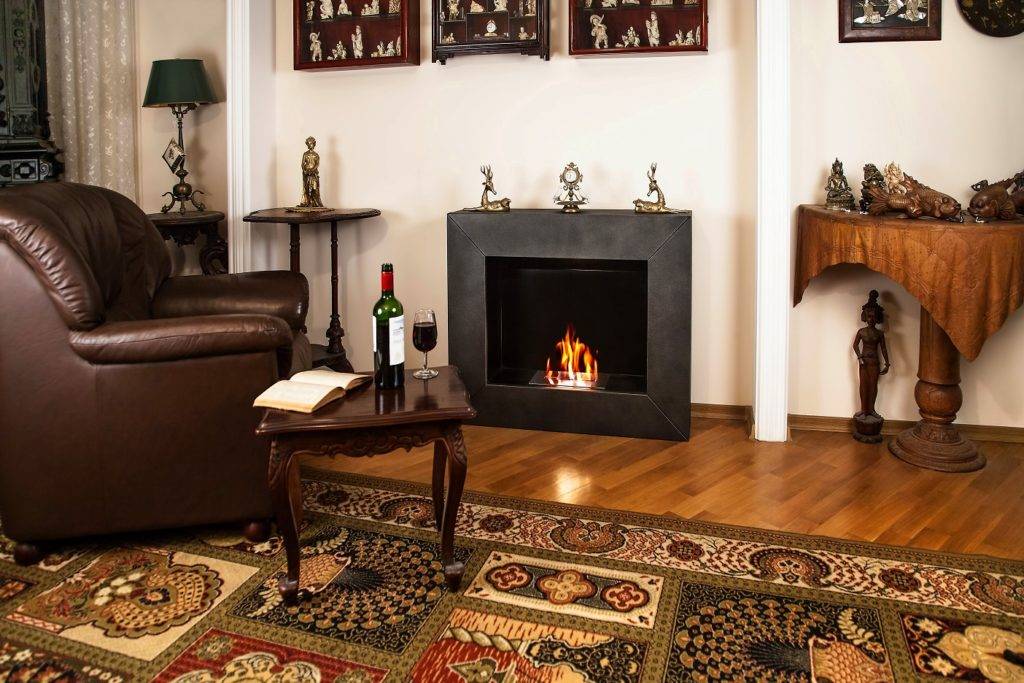 - Биокамин — это достаточно новый вид, только недавно стали устанавливать. Идеально подходит для деревянных домов, так как функционирует при помощи вещества — этанола. Внутри печки находится специальный контейнер для заполнения этанолом, а также керамическая система горения. Достоинств этой разновидности — нет ни золы, ни сажи, ни других осадков, а также камин не производит выбросов вредных веществ. Единственный минус — он совсем не обогревает, исполняет только декоративную функцию. Их можно монтировать на стену, могут быть подвесными, напольными или даже настольными. Дымоход устанавливать необязательно.