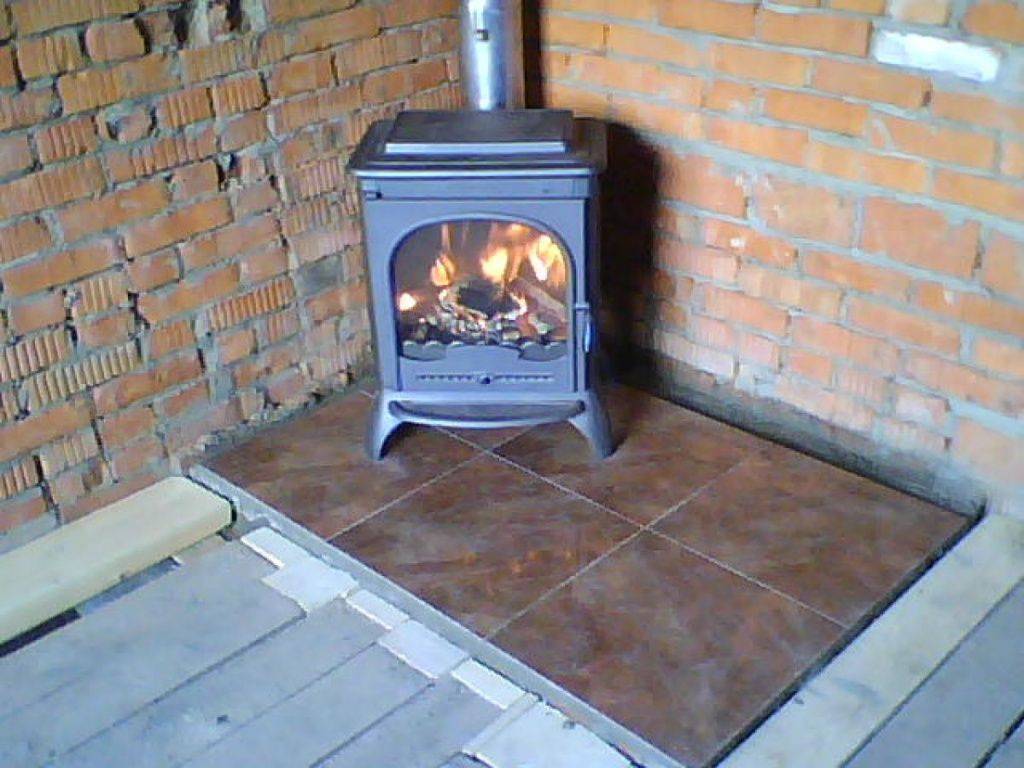 Если камин устанавливается на деревянном полу, то по периметру необходимо проложить металлический лист или выполнить на покрытие из керамической плитки с отступом на 30-35 мм с каждой стороны.