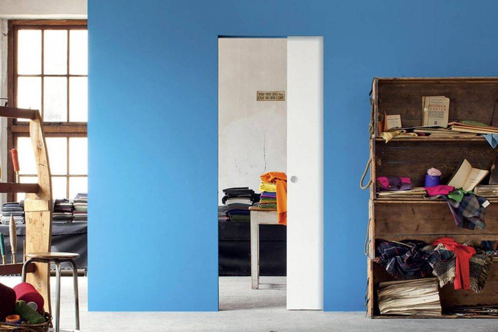 Если планируется установка сдвижной двери внутрь перегородки, следует произвести демонтаж части стены. Для этого увеличивают проем на ширину дверного полотна, а затем монтируют нишу из гипсокартона. Перегородка в стену должна заходить так, чтобы оставалась только небольшая часть полотна, на которой находится ручка.