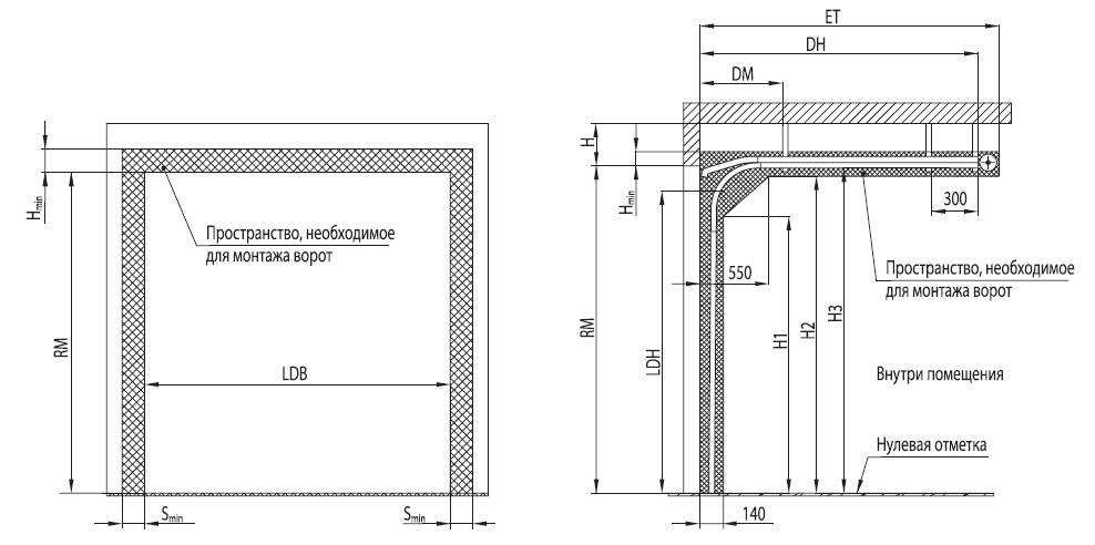 - Ширина боковых расстояний, или заплечников, — расстояние от вертикальных краёв проёма до ближайшей стены. В зависимости от конструкции ворот заплечники должны быть не мене 140 или 250 мм.