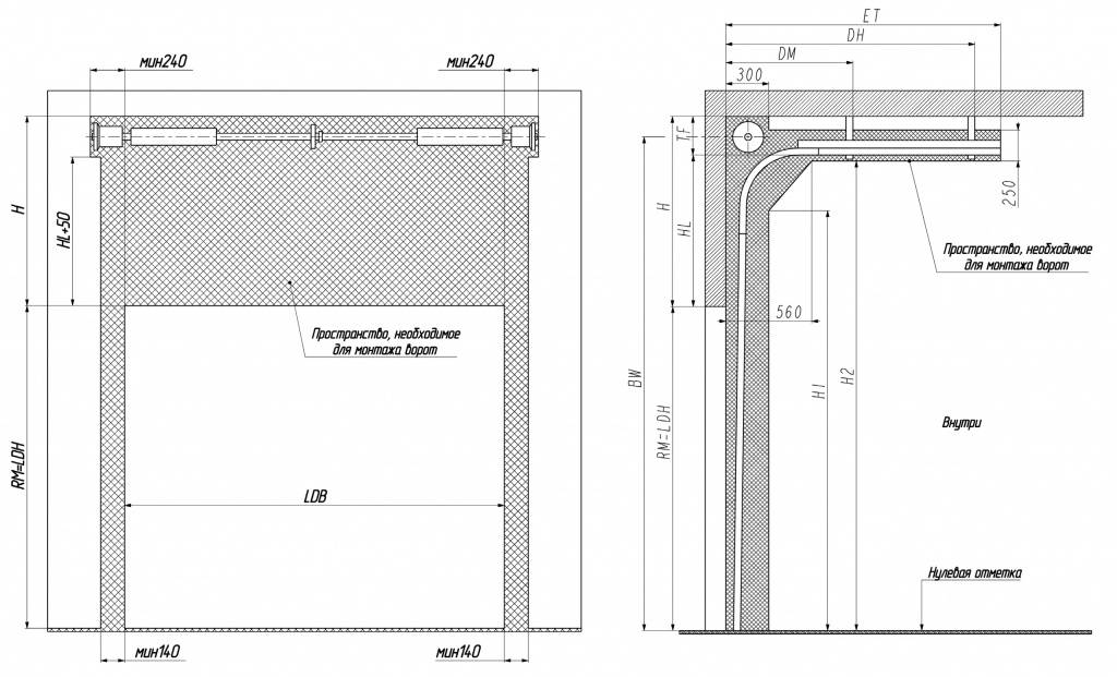 - Высота притолоки — разница между общей высотой гаража и высотой проёма на просвет (при взгляде изнутри).