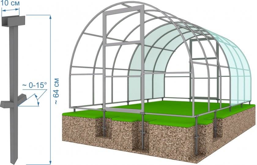 Свайная основа идеально подходит для зыбкой, неустойчивой почвы, надежно закрепляя каркас теплицы. Внутри каждой сваи размещают прут, а затем наполняют бетоном. Это создает удивительную прочность. Именно к прутам приваривают и закрепляют тепличную конструкцию.
