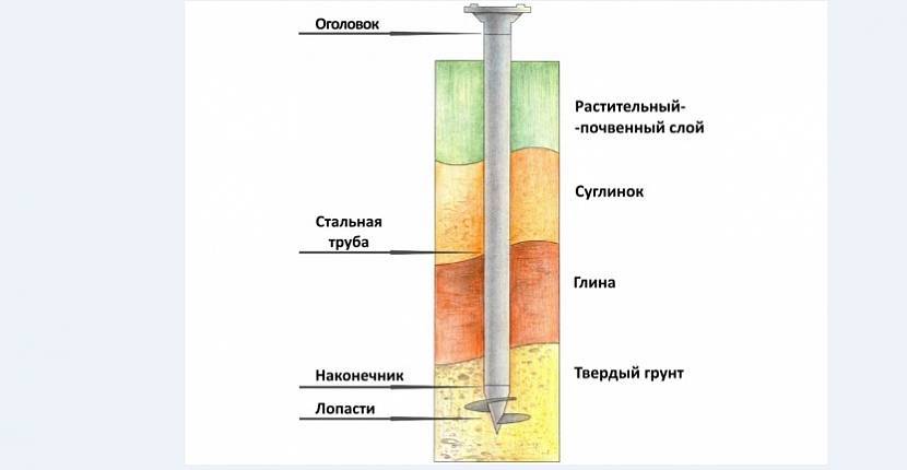 Свая винтовой конструкции состоит из ствола, который может быть цельным или составным, и наконечника. Суть её применения заключается в том, чтобы за счёт поворотных усилий пройти слабые слои грунта и зацепиться за плотные, несжимаемые пласты. В грунте она фиксируется благодаря лопастям, их же поверхностью, а не только стволом, опирается на грунт.