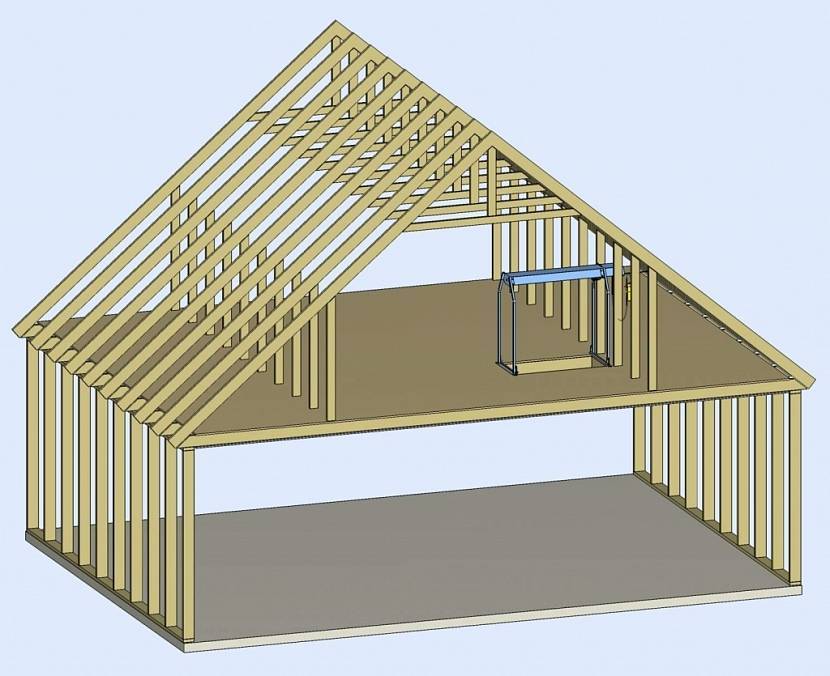 Если кровля возводится на строении небольшой ширины, то монтируются А-образные конструкции (коньковый прогон не нужен). Горизонтальной перемычкой (ригелем) обеспечивается требуемая жесткость, а также снижается нагрузка на распор. Верхнее крепление стропильных ног усиливается деревянной либо металлической накладкой.