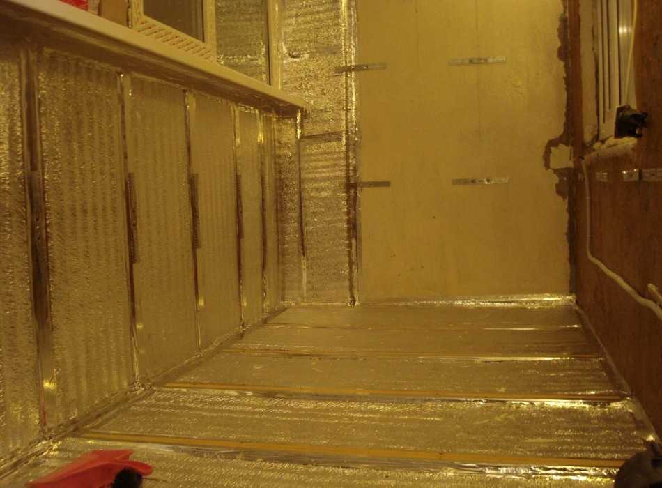 Гидроизоляция балконных перегородок производится по технологии, которая не отличается от обработки пола и потолка. Оптимальной считается изоляция с использованием фольгированных пенополистирольных плит. Плита приклеивается к перегородке строительной смесью с высокой влагостойкостью. Для межплиточных швов используется армирующая сетка.