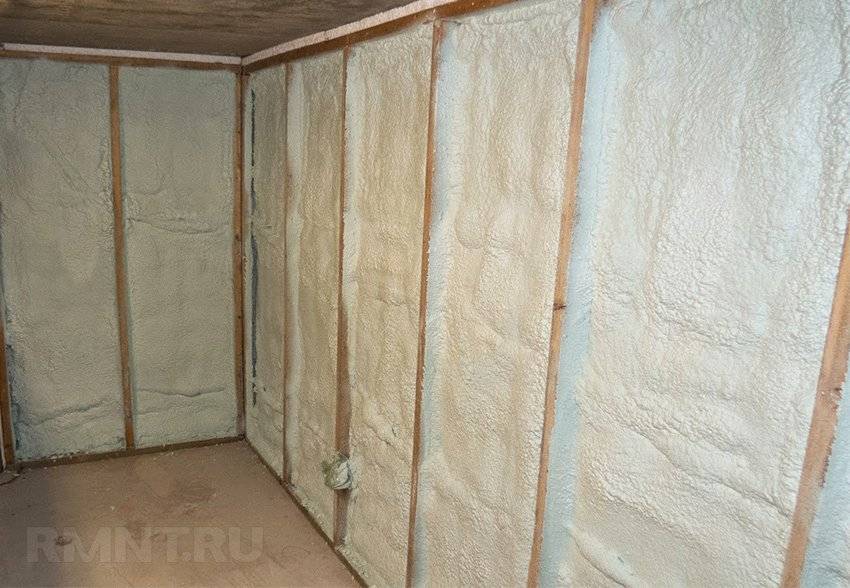 Нанесение слоя вспененного полиуретана требует наличия специального оборудования и монтажа каркаса. Работы выполняются специалистами, имеющими практический опыт. Прочность застывшей пены невысокая и его закрывают защитной облицовкой (ГКЛ, фанера). Подробнее о смотрите в этом видео: